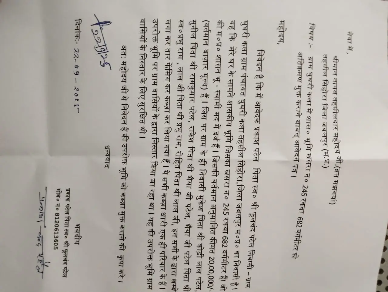 जनपद पंचायत के अंतर्गत ग्राम पंचायत घुघरी कला मैं आज शासन की लगभग 20 लाख की जमीन पर दबंगों के द्वारा कब्जा किया गया है जिसकी शिकायत नायब तहसीलदार सिहोरा के सामने उपस्थित की गई है बताया गया है कि गांव के ही मुकेश सुनील राकेश भैया जी लाल जी रोहित यह सभी पटेल व्यक्ति हैं और एक ही परिवार के यह सभी व्यक्ति बताये जा रहे हैं जिन्होंने आज शासन की 245 रखवा नंबर की जमीन पर कब्जा किया गया है जिसकी शिकायत प्रकाश चंद्र पटेल के द्वारा नायब तहसीलदार सिहोरा को दी गई है एवं मौखिक तौर पर भी बताया गया है कि इन सभी लोगों ने अपनी दबंगई से तार फेंसिंग भी कर लिया है कहते हैं कि हमारा कोई कुछ नहीं कर लेगा क्योंकि हमने सेटिंग से काम किया है अब यह देखा जाएगा की शासन द्वारा जमीन का कब्जा हटाया जा रहा है कि नहीं अथवा दबंगों का ही राज चलेगा क्या